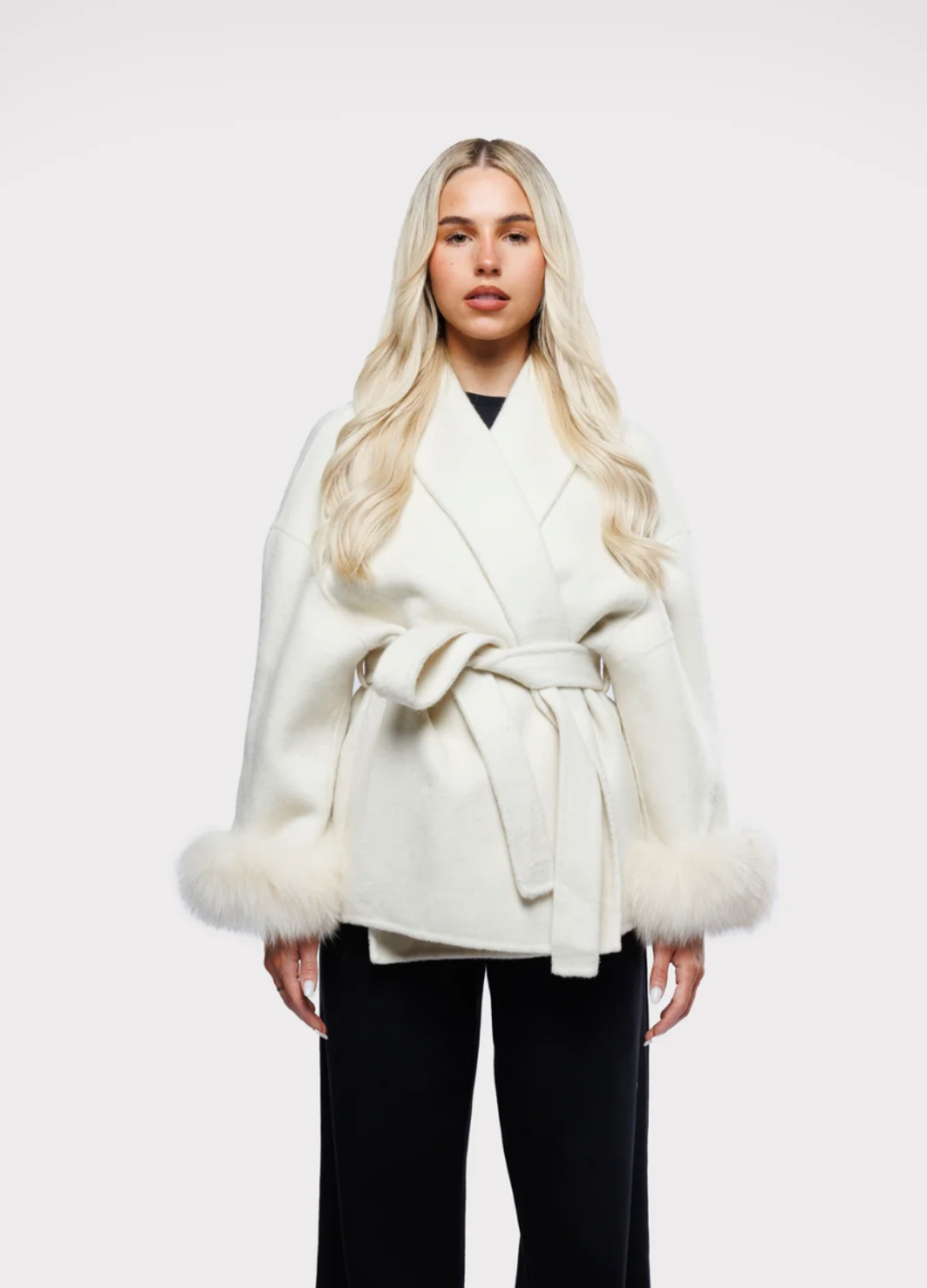 Cappotto caldo ed elegante in morbido cashmere, che garantisce comfort e un look senza tempo nei mesi più freddi. Ha una vestibilità ampia e si allaccia in vita con una cintura, che permette di regolare il capo a piacere. La particolarità del cappotto sono i polsini rifiniti con vera pelliccia, che aggiungono un tocco speciale e valorizzano l’intero look. Si abbina perfettamente sia a calzature sportive che a quelle più classiche.